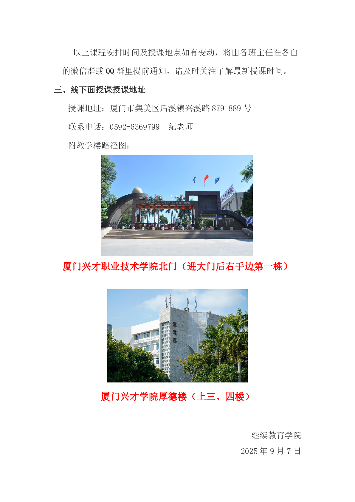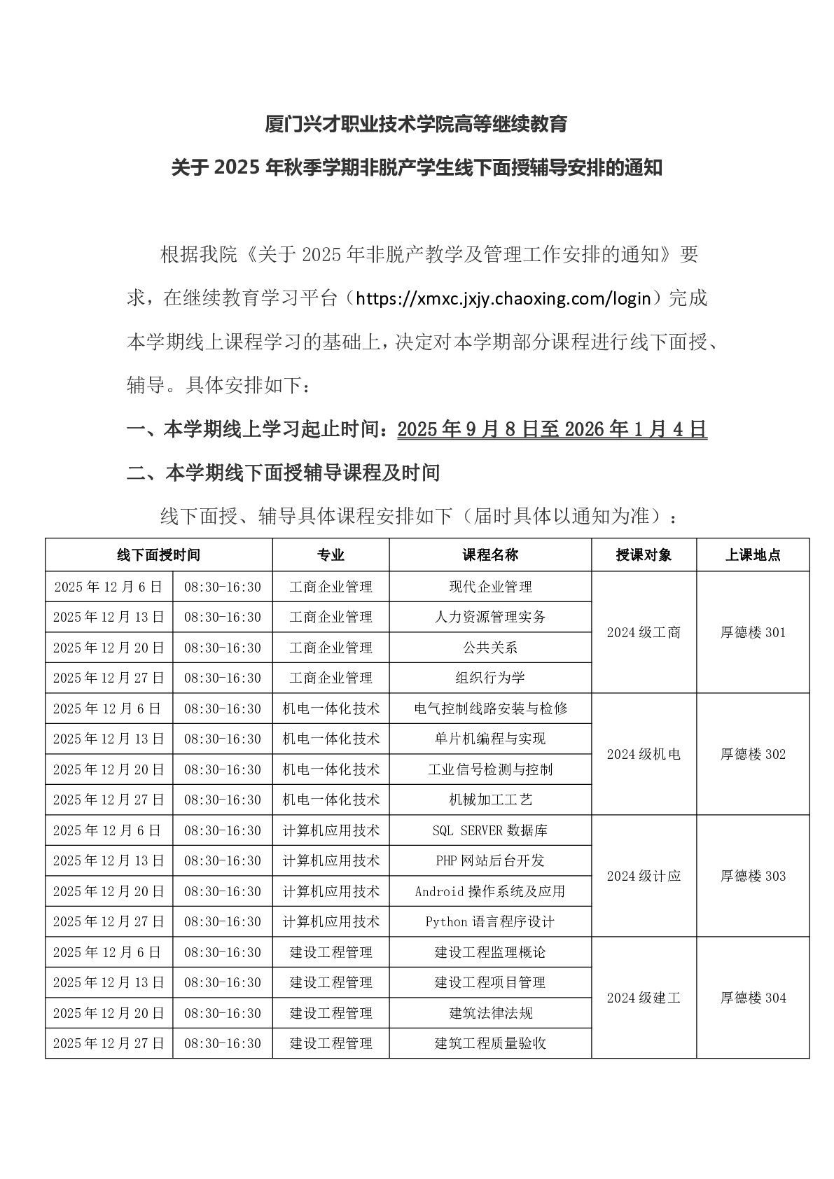 厦门兴才职业技术学院成人高等教育2025年下半年线上线下学习安排通知